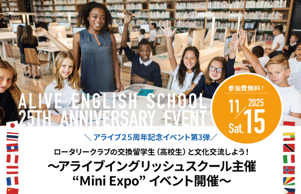 アライブでは、25年間にわたり、英語教育を軸に「人と人をつなぐ教育」を展開してきました。今回の文化交流 Mini Expo は、ロータリークラブの交換留学生と共に、「国際理解の第一歩を地域の子どもたちに」というコンセプトから生まれた取り組みです。