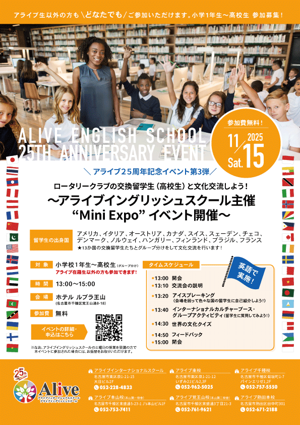 株式会社アライブ(本社:愛知県名古屋市、代表取締役:三井博美)は、創立25周年を記念した特別イベントの第3弾として、2025年11月15日(土)にロータリークラブ世界13ヶ国の交換留学生との「文化交流 Mini Expo」を開催します。