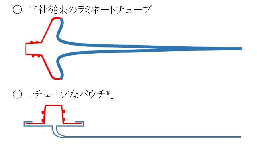 「チューブなパウチ(R)」シリーズは胴体フィルムの厚みが薄く、封筒状に折り畳む加工を施すことで、胴体を握った時の弾力を軽減し、容易に中身を絞ることが可能です。さらに注出口のプラスチックパーツを水平に設計することで、当社従来のラミネートチューブと比較して内容物を最後まで絞りやすくなっています。