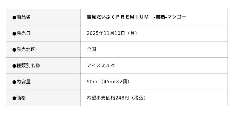 株式会社ロッテ(東京都新宿区、代表取締役社長執行役員:中島英樹)は、「雪見だいふく」ブランドから、贅沢な味わいが楽しめるプレミアムシリーズ『雪見だいふくPREMIUM ‐濃熟‐マンゴー』を11月10日(月)より全国で新発売します。クリーミーで軽いくちどけのアイス、果実の味わいの感じられるマンゴーソースを橙色のお餅で包んだ商品です。濃厚で熟したマンゴーの味わいを再現する為に、ソース部には“マンゴーの王様”といわれるアルフォンソマンゴー果汁を使用。また、食感を感じられるケント種のダイス果肉を使用し、濃密で贅沢な果実感を表現しています。雪見だいふくのマンゴー味は、これまで日本国内では飲食店やロッテオンラインショップのみでの販売で、そこでしか味わうことのできなかったフレーバーでした。今回、贅沢なプレミアムタイプとなり、満を持しての発売となります。日常の中でのゆったりした時間のお供に「雪見だいふくPREMIUM」はいかがでしょうか。