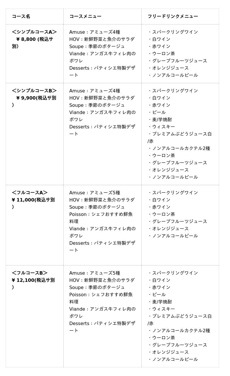 ※金額はすべて消費税込み・サービス料別の表記です(サービス料10%)