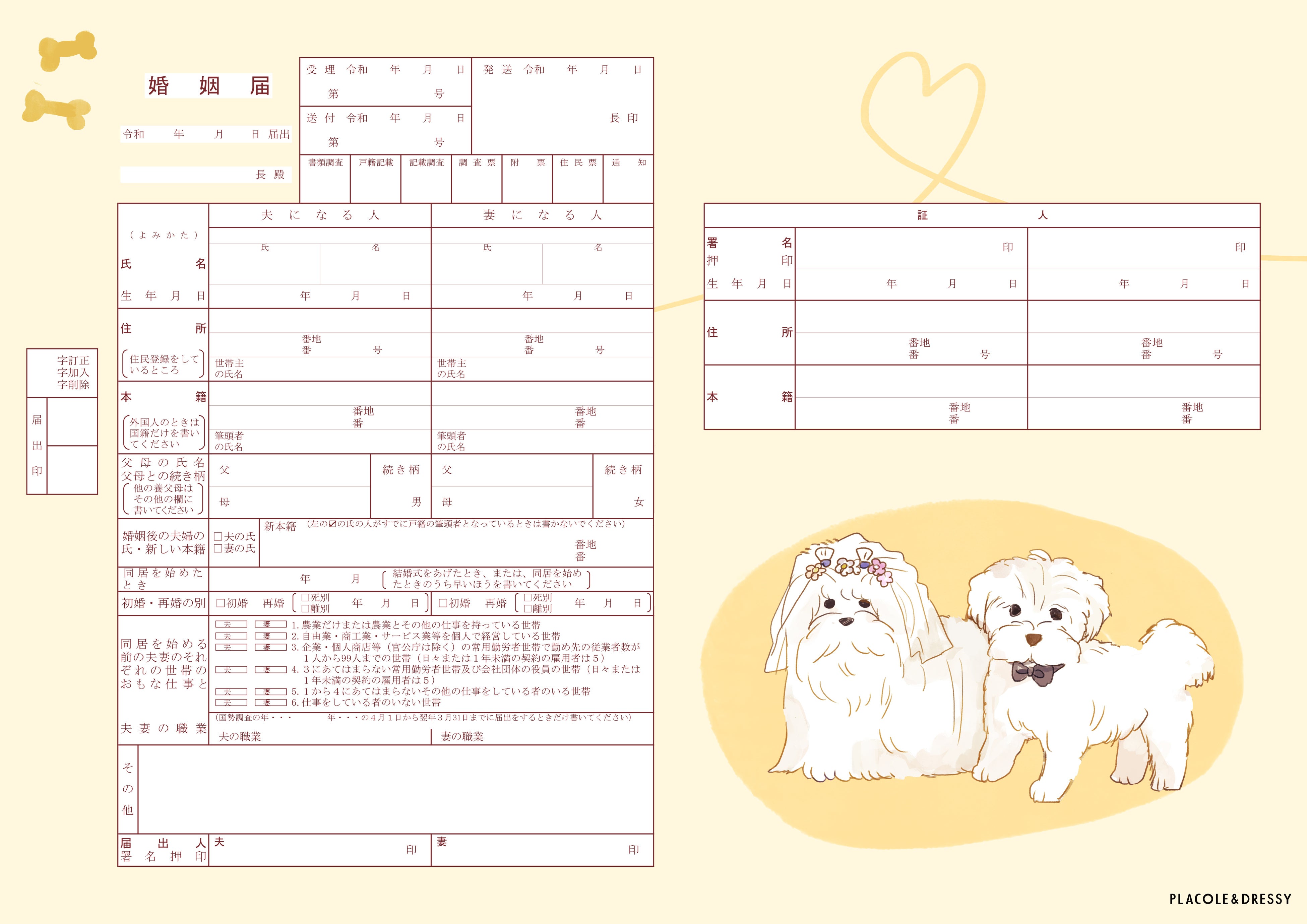 純白のマルチーズがモチーフの、上品でナチュラルな印象の婚姻届。優しく柔らかなタッチのイラストが、おふたりの特別な日をあたたかく包み込みます。