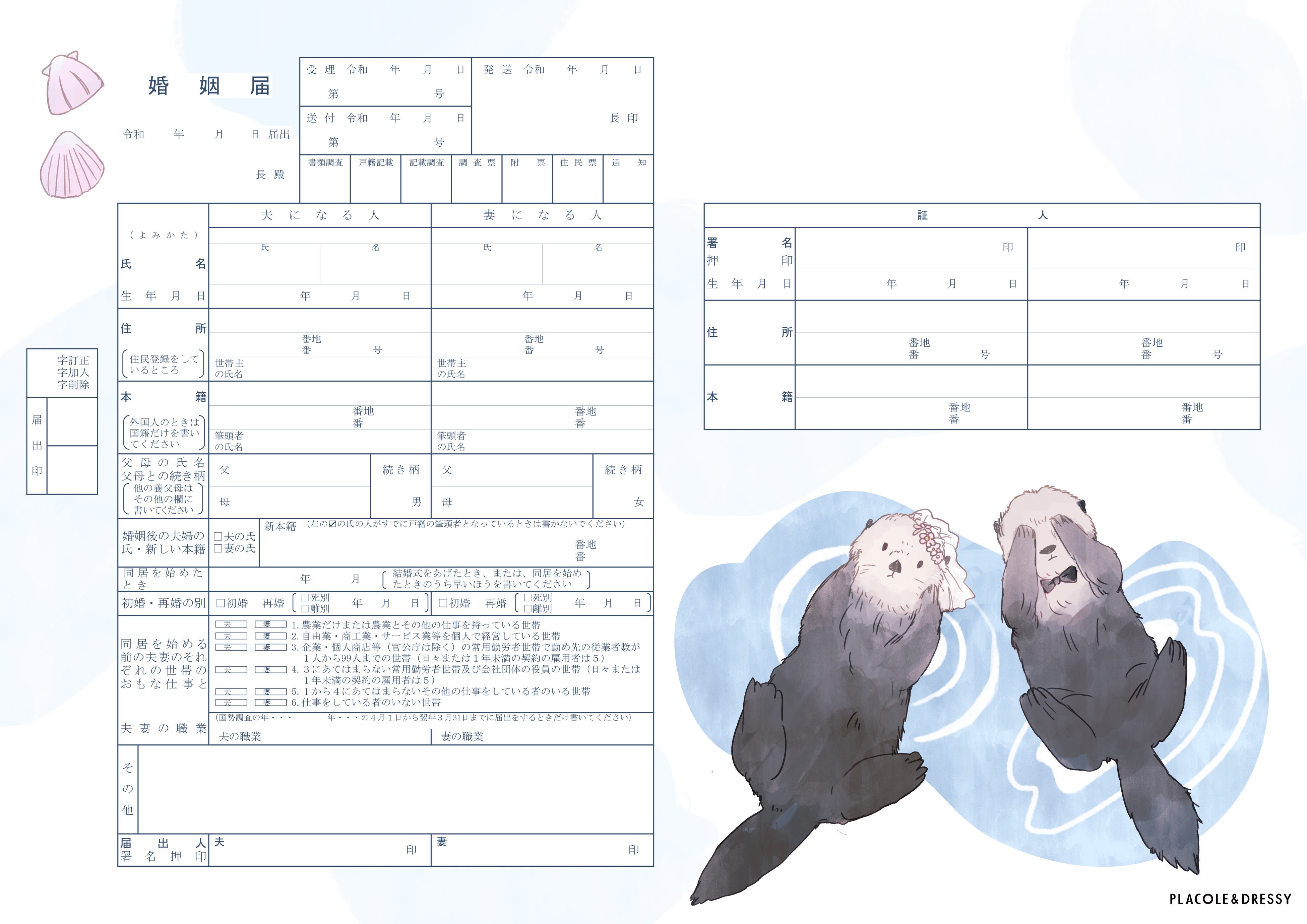 水の上で仲良く寄り添うラッコのイラストが描かれたデザイン。お互いを想い合いながら、やさしい時間を重ねていくおふたりをイメージしています。見るたびに笑顔になれる、癒しの婚姻届です。