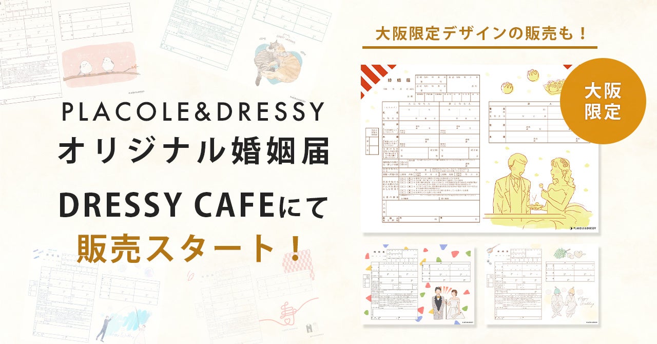SNS総フォロワー数2500万人を超える「PLACOLE&DRESSY」がプロデュースし、11月1日にオープンするウェディングのテーマパークカフェ『DRESSY CAFE OSAKA』にて『PLACOLE&DRESSY婚姻届』の取り扱いが決定。DRESSY CAFEでは、大阪限定のご当地デザインや、ダウンロード数上位の人気デザインを取り揃えております。素敵なご結婚記念におふたりらしい、おしゃれな婚姻届をご利用ください。