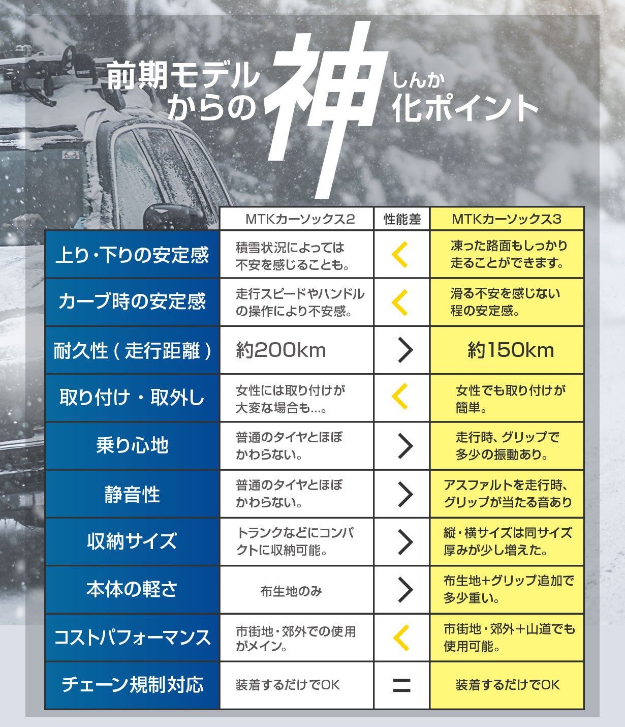 前回Makuakeで2899%達成の「MTKカーソックス2」。今季の「MTKカーソックス3」は今までの経験を活かしグリップ力にフォーカス!坂道や横滑りに強く、装着のしやすさはそのまま。