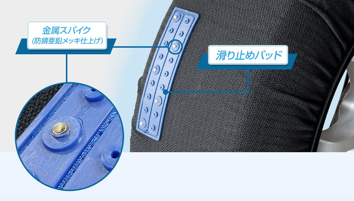 今期のMTKカーソックス3には、TPU素材の滑り止めパッドと、防錆亜鉛メッキを施した金属スパイクを搭載しています。従来の布製タイヤチェーンでは不安があった、坂道の上り下り、カーブ、凍結路でも、地面をしっかりとグリップし安定感がアップしました。