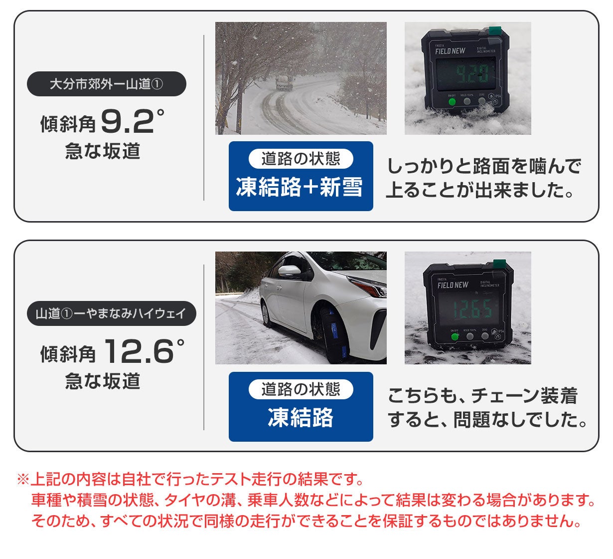 滑り止めパッドのない従来の布製タイヤチェーンでは、住宅地の緩やかな坂や小高い丘程度の坂道は問題なく走行できます。しかし、市街地の丘陵地や急な坂道では、路面状況によって登れないこともありました。