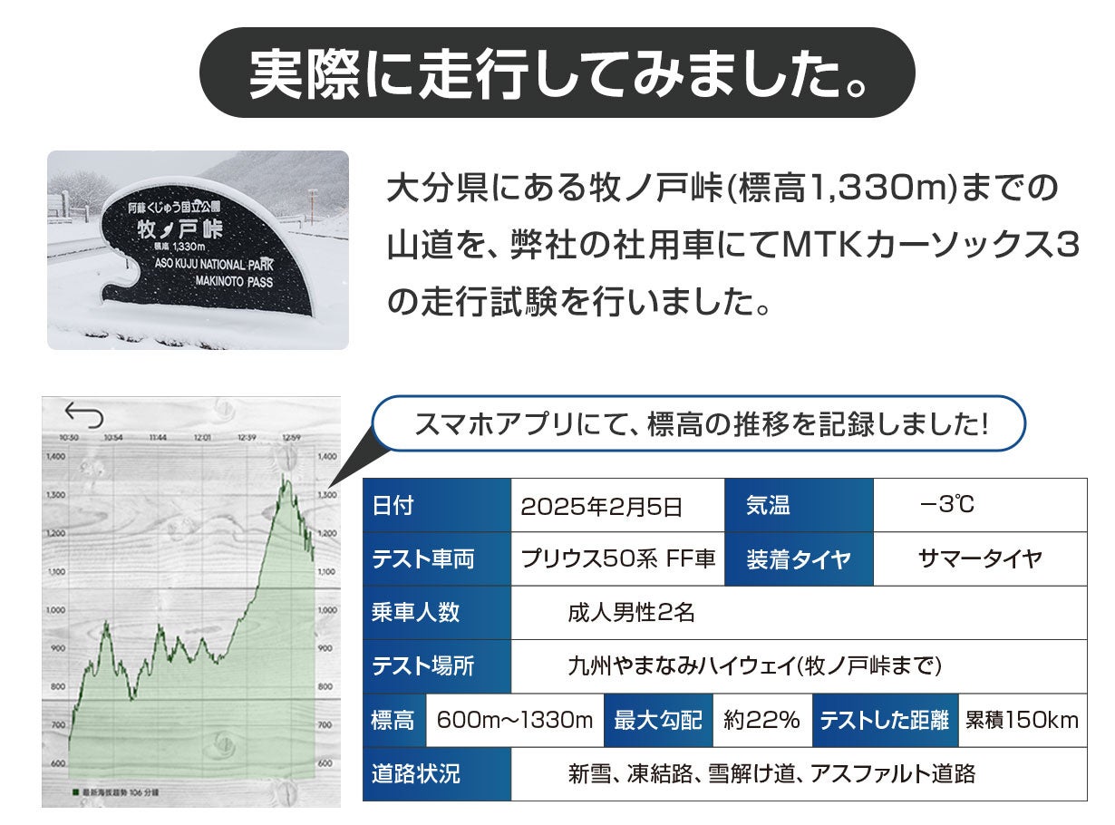 今季の「MTKカーソックス3」では、従来登れなかった坂道でもしっかりと地面をグリップし、安定して登りきることが可能です。