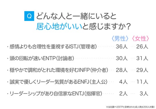 ESTP(起業家)と診断された成人男女200人に、どんな人と一緒にいると居心地がいいか尋ねたところ、「感情よりも合理性を重視するISTJ(管理者)」が最多回答でした。