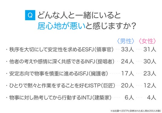 ESTP(起業家)と診断された成人男女200人に、どんな人と一緒にいると居心地が悪いか尋ねたところ、「秩序を大切にして安定性を求めるESFJ(領事官)」が最多回答でした。