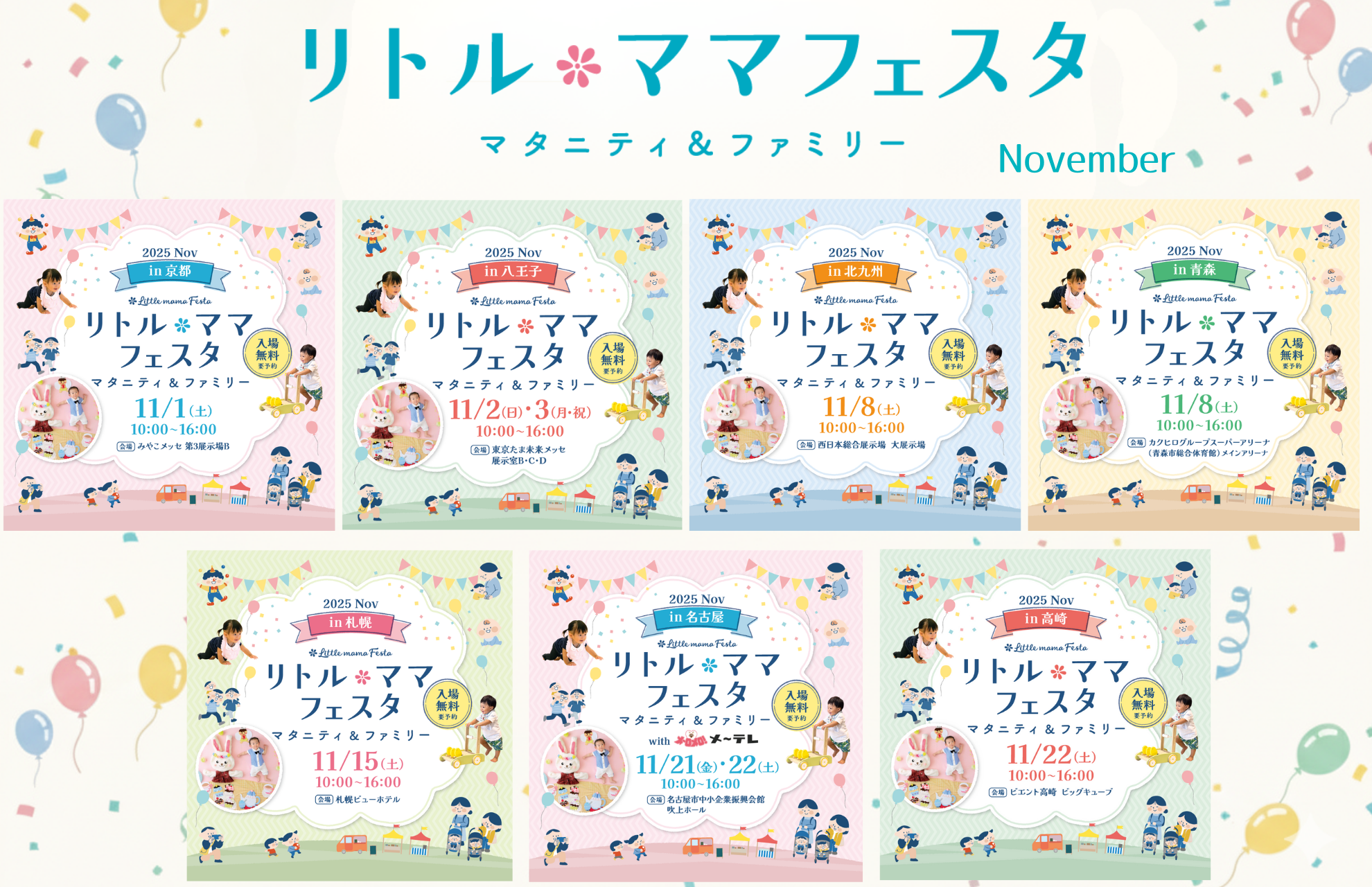 国内最大規模の親子フェスタを開催する株式会社エンファム.は、11月1日(土)京都、11月2日(日)・3日(月・祝)八王子、11月8日(土)北九州・青森、11月15日(土)札幌、11月21日(金)・22日(土)名古屋、11月22日(土)高崎の7都市にて、親子向けイベント【リトル・ママフェスタ】を開催いたします。会場では、親子で一緒に楽しめるステージや、毎回大人気のキッズレース、おひるね・おすわりアート撮影会(事前予約制)など、笑顔あふれる体験型プログラムをご用意。ママ・パパとお子さんの"思い出づくりの場"として、ご家族皆様でお楽しみください。