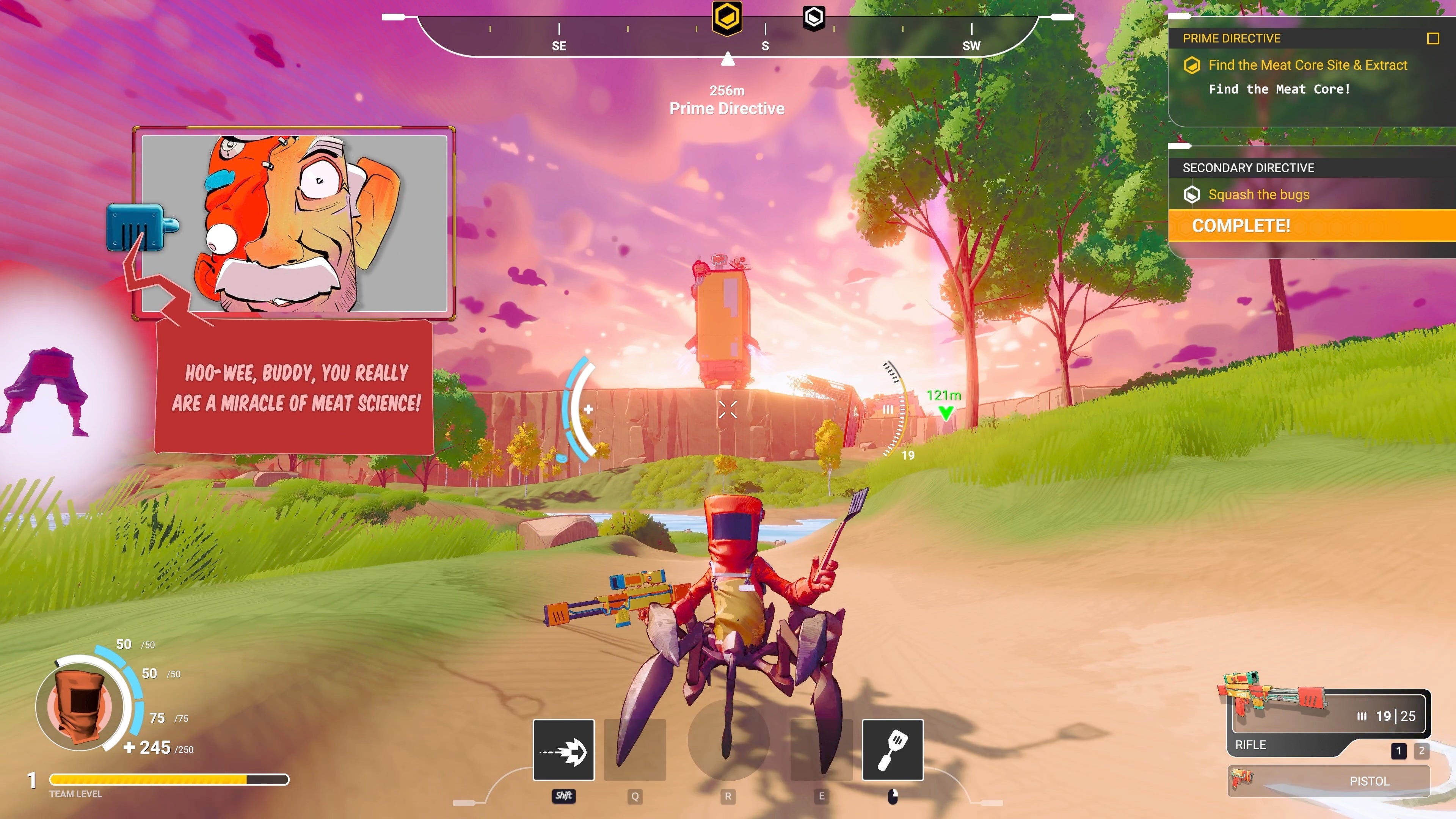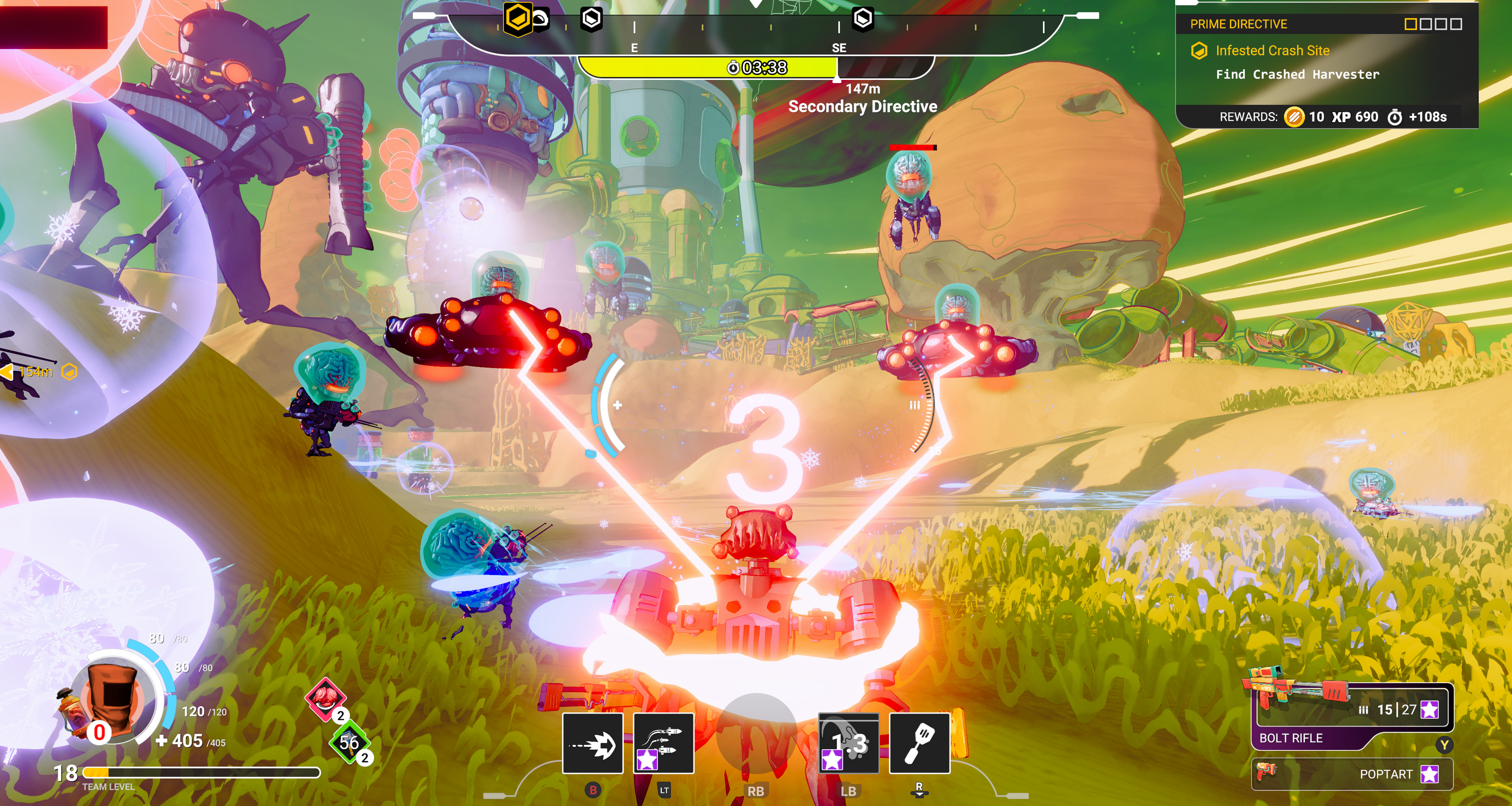 「Smart Meat(TM)」と呼ばれるRangus Meats社独自のテクノロジーによって、プレイスタイルを瞬時に切り替えながら戦うことが可能です。採取したエイリアンごとに異なるパーツが手に入り、それぞれが特有の能力を持っています。たとえば、トリプルジャンプができる脚部、タレットを設置できる胴体、グレネードを発射する七面鳥の頭など--どの部位も戦闘スタイルを劇的に変化させます。時間は常に味方ではなく、プレッシャーは止むことがありません。