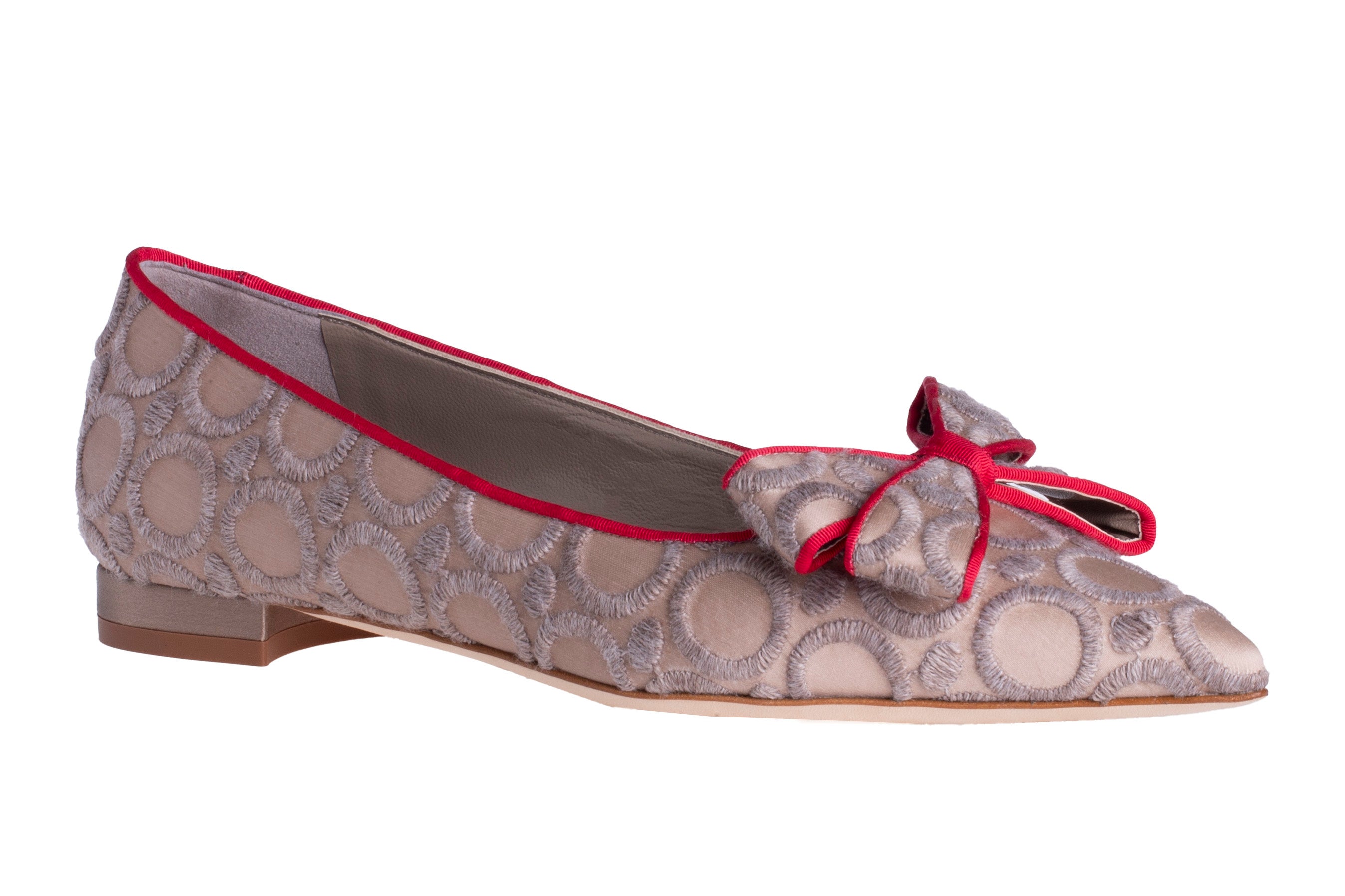 サテン生地に繊細なサークル刺繍を施し、ネイビーとグレーの2色展開。ネイビーにはホワイトのパイピング、ベージュにはレッドのパイピングとボウを組み合わせ、エレガントな遊び心を添えています。