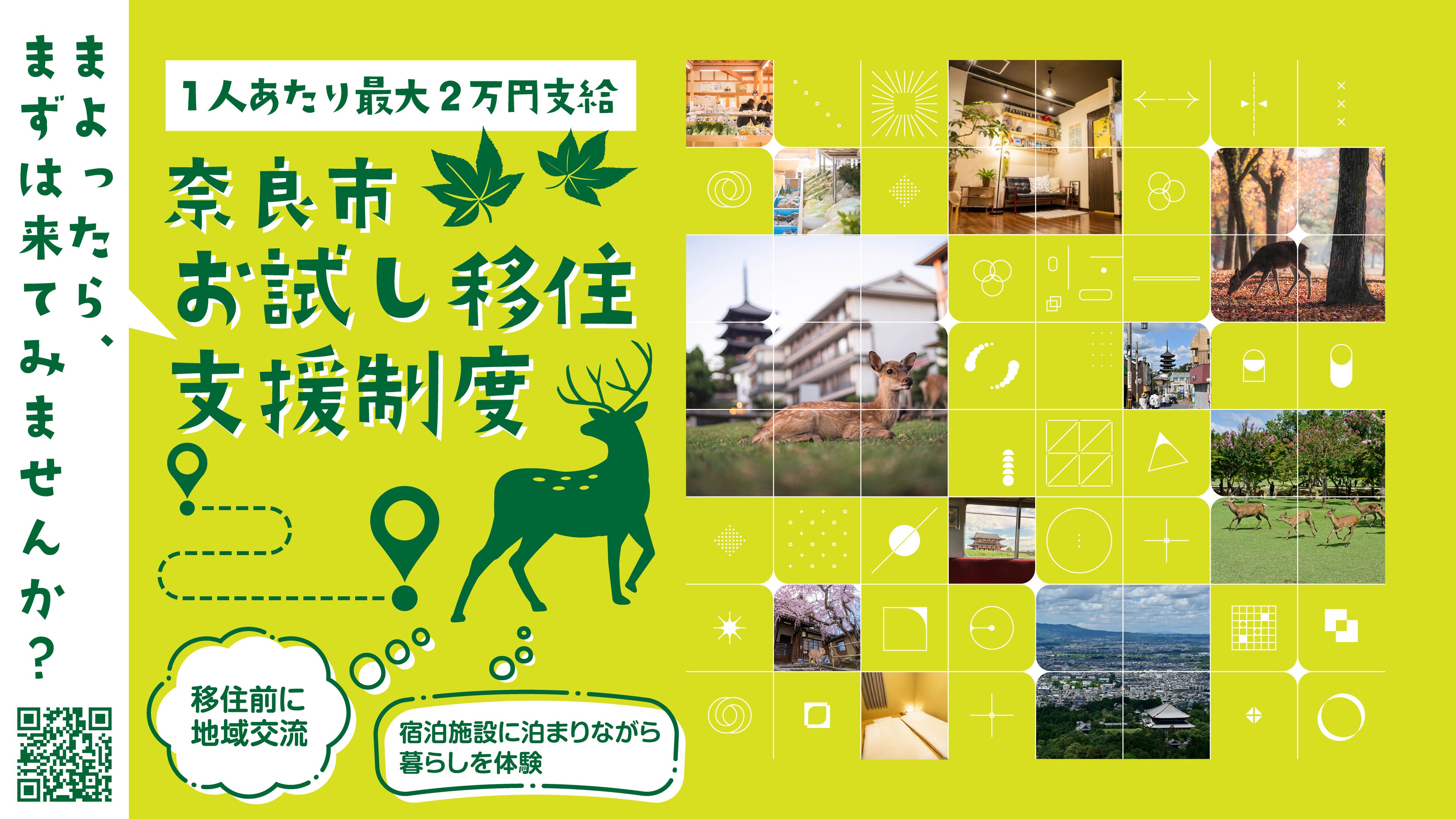 そんな方に向けて奈良市が実施しているのが「お試し移住支援制度」。「観光」ではなく、「暮らしを体験する」目的で対象宿泊施設に連泊した方に、支援金(宿泊経費の一部を1人1泊あたり2,000円分、最大2万円分)を補助する制度です。