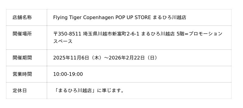 北欧デンマーク・コペンハーゲンで誕生し、ヨーロッパを中心に世界中に店舗を展開するユニークなデザイン雑貨ストア Flying Tiger Copenhagen(運営:Zebra Japan株式会社/本社:東京都渋谷区神宮前/代表取締役:松山恭子)(略称「フライングタイガー」)は、埼玉県川越市の百貨店「まるひろ川越店」の5階=プロモーションスペースにて、期間限定のPOP UP STOREを開催します。