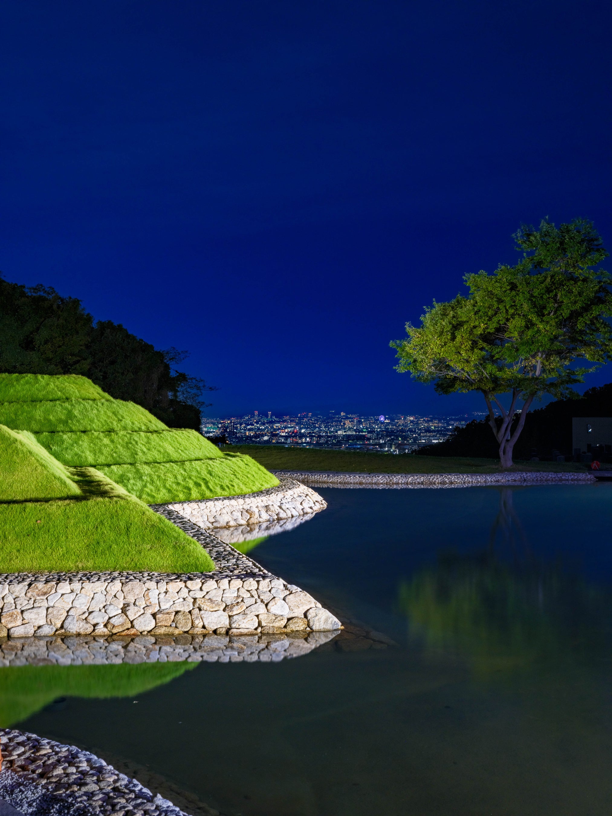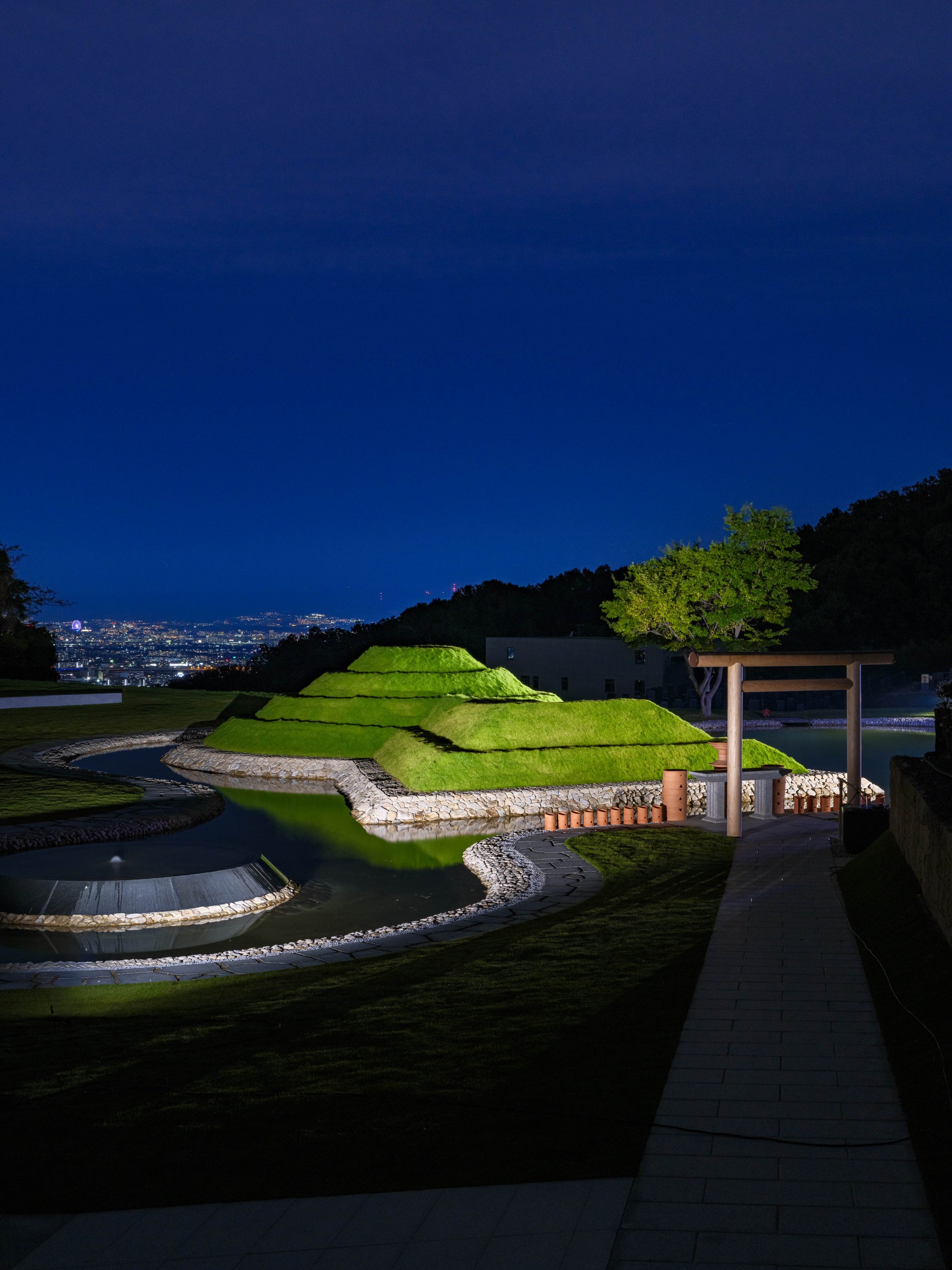 夜のライトアップされた大阪メモリアルパーク古墳墓