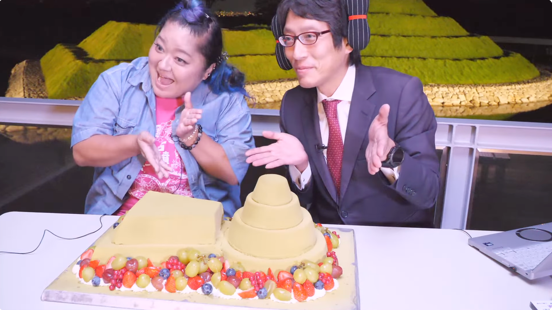 竹田恒泰チャンネルの前半は、大阪府高槻市・今城塚古墳公園で行われる「古墳フェス」主催者マキさんにご出演いただき、対談形式でスタート。古墳文化に精通するふたりが、大阪メモリアルパーク古墳墓の再現性の高さや形状の美しさ、設計にまつわる話を繰り広げました。また、古墳墓完成を記念した大阪メモリアルパーク「古墳ケーキ」も登場。古墳文化への熱気とともに、和やかな雰囲気に包まれました。
