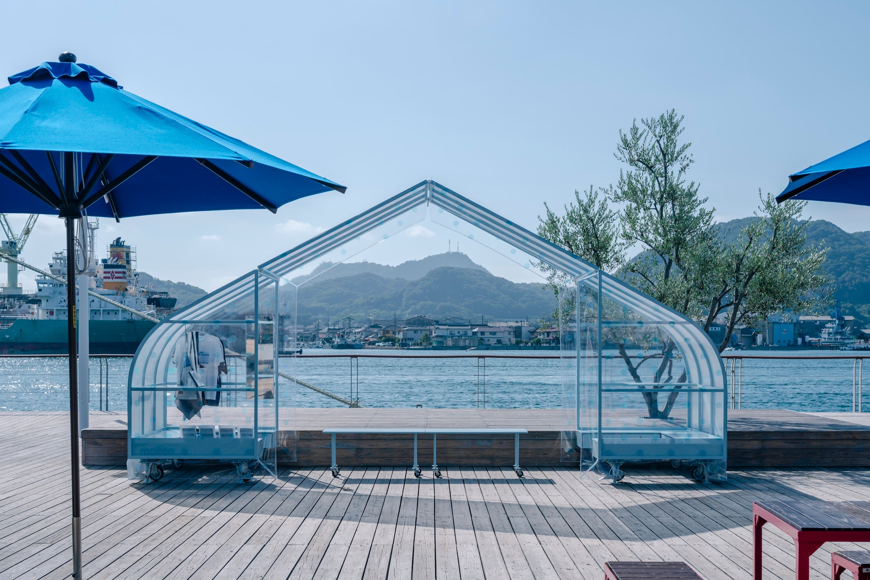 建築祭出展作品、建築家・中山英之 × モルテンによる移動型キオスク-小さな建築「風景が通り抜けるキオスク(Catch)」がONOMICHI U2に隣接するオリーブ広場に登場します。半透明な素材で覆われた小さな建築は、収納されたさまざまな物や道具と、訪れた人々や子どもたちが出会う創造の場所です。