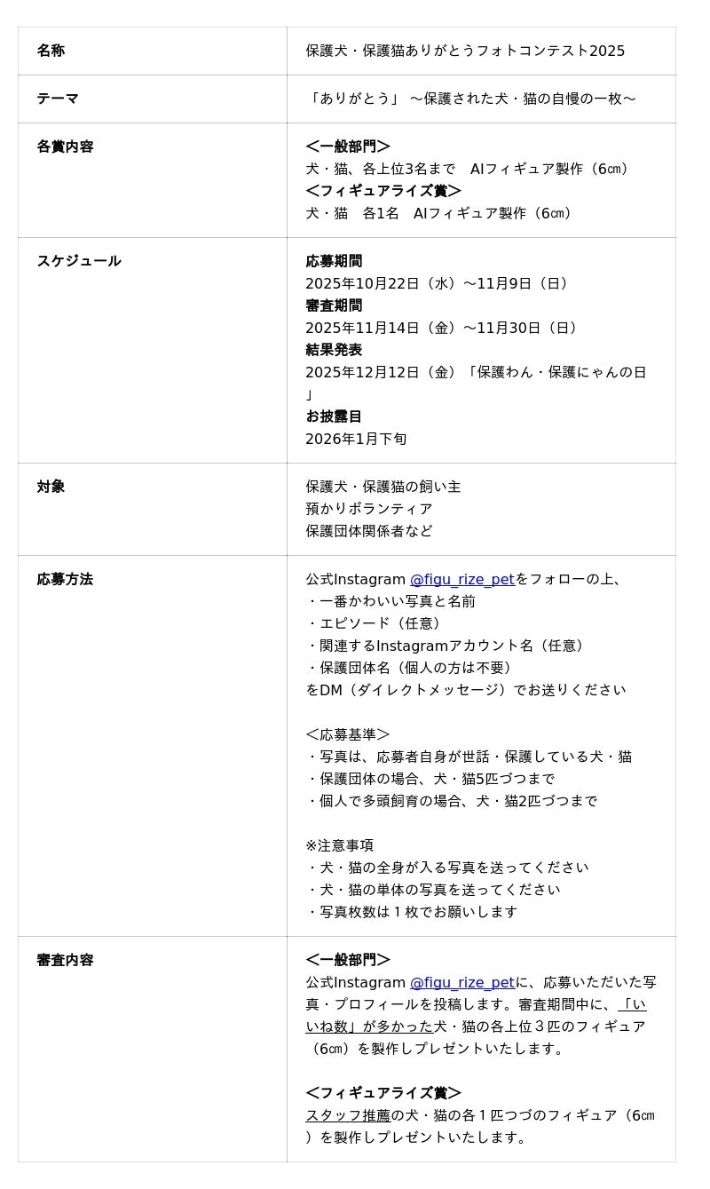 AI技術で写真を立体模型(フィギュア)にする専門店「FIGURE RIZE(フィギュアライズ)」(さいたま市大宮区)は、保護犬・保護猫を支える人々に感謝を伝える「保護犬・保護猫ありがとうフォトコンテスト2025」を2025年10月22日(水)より開催します。