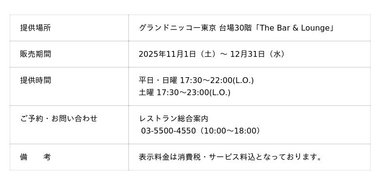 「東京を楽しむ 東京をくつろぐ」ひとときをお届けするグランドニッコー東京 台場(住所:東京都港区 総支配人:塚田 忠保)は、ホテル最上階から東京の夜景を一望できる「The Bar & Lounge」にて、酸味と甘みのハーモニーが絶妙な『大人のショコラオレンジパフェ』、冬の訪れを彩る『Winter Cocktail Selection』を、2025年11月1日(土)~ 12月31日(水)の期間限定で提供いたします。