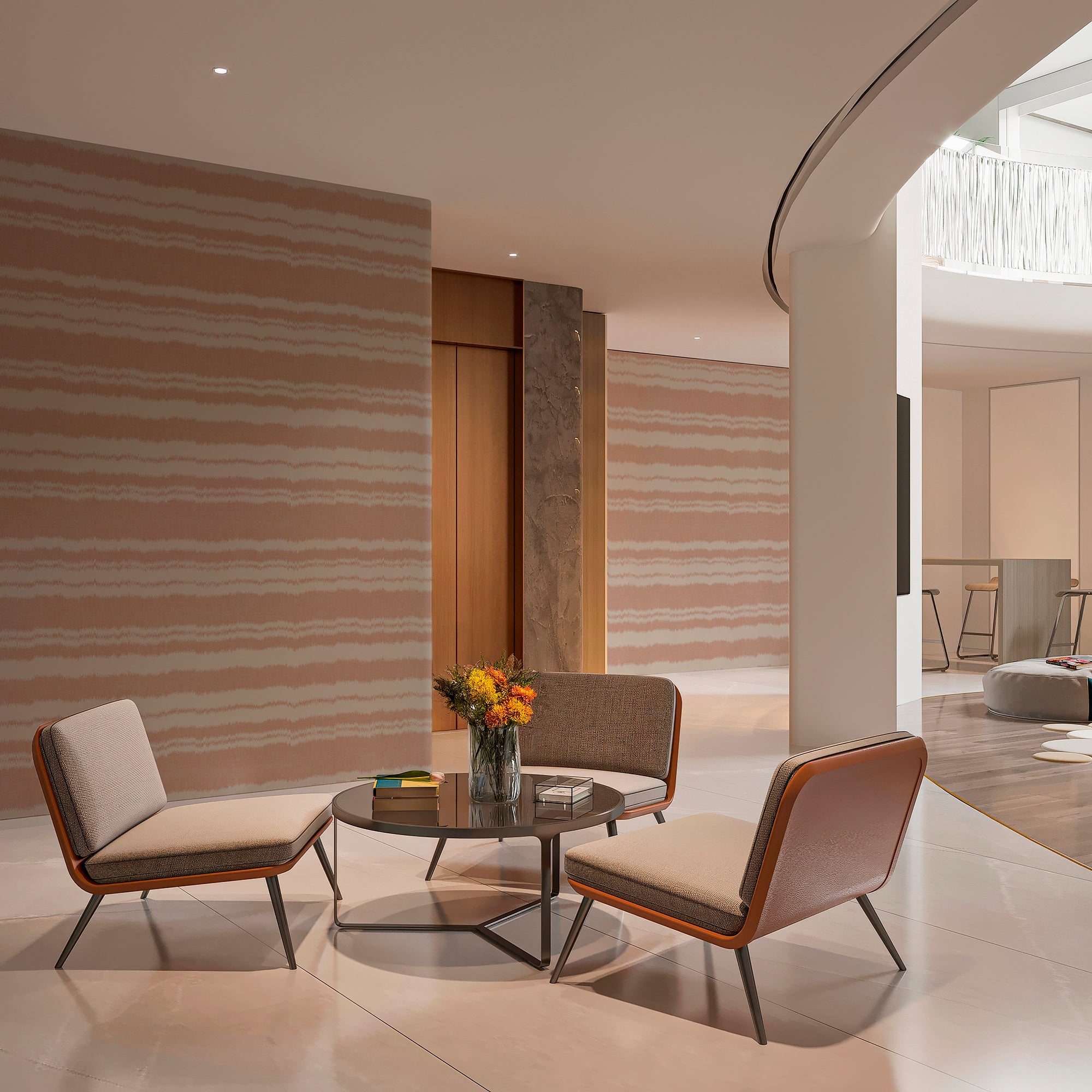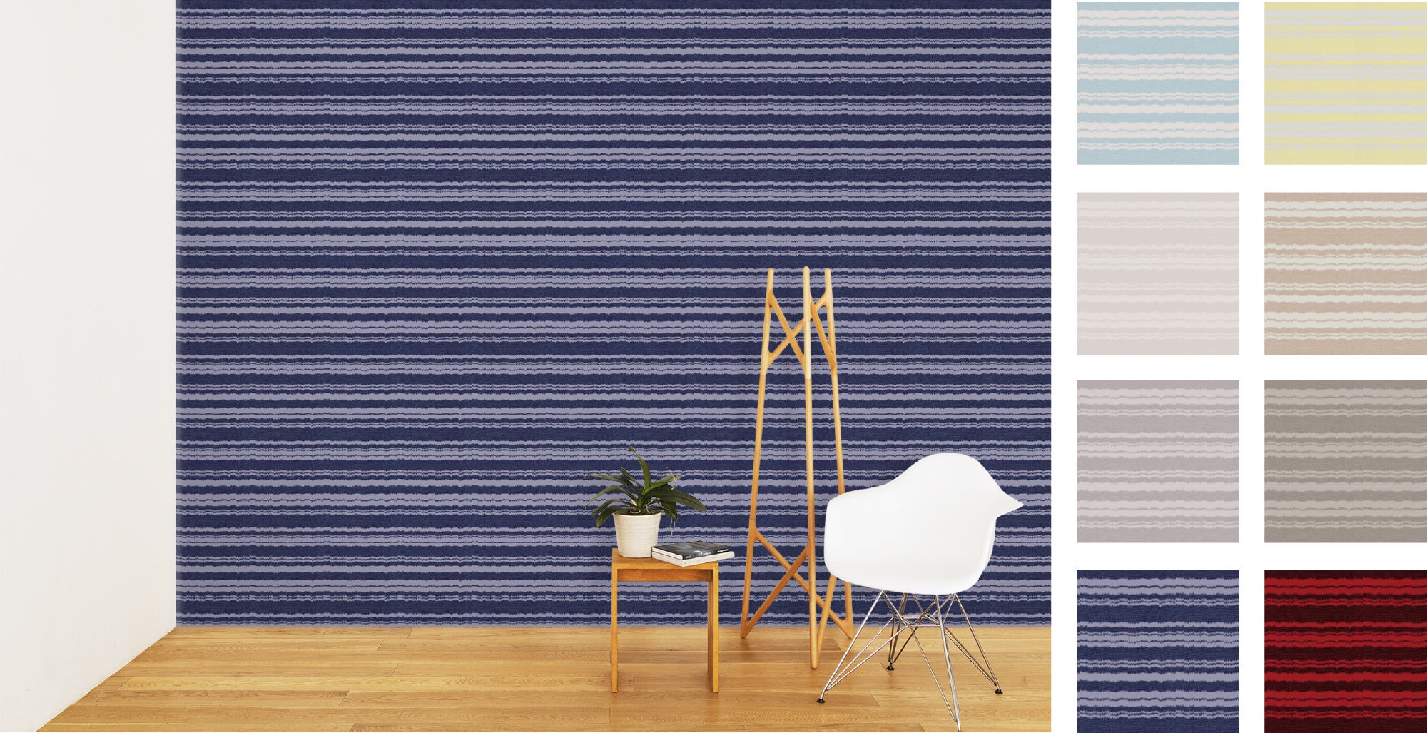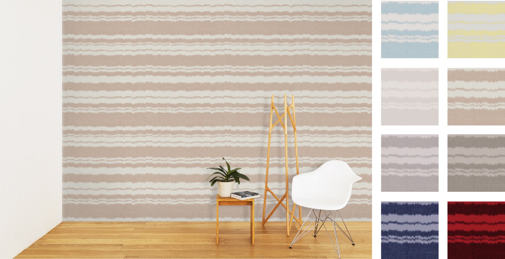 壁紙では、現代的な空間にもマッチするよう詳細にデフォルメをおこない、インテリアとして最適な色味や“あべこべ”を象徴する境界線のゆらぎを引き立てる色差を意識したカラー展開となっています。