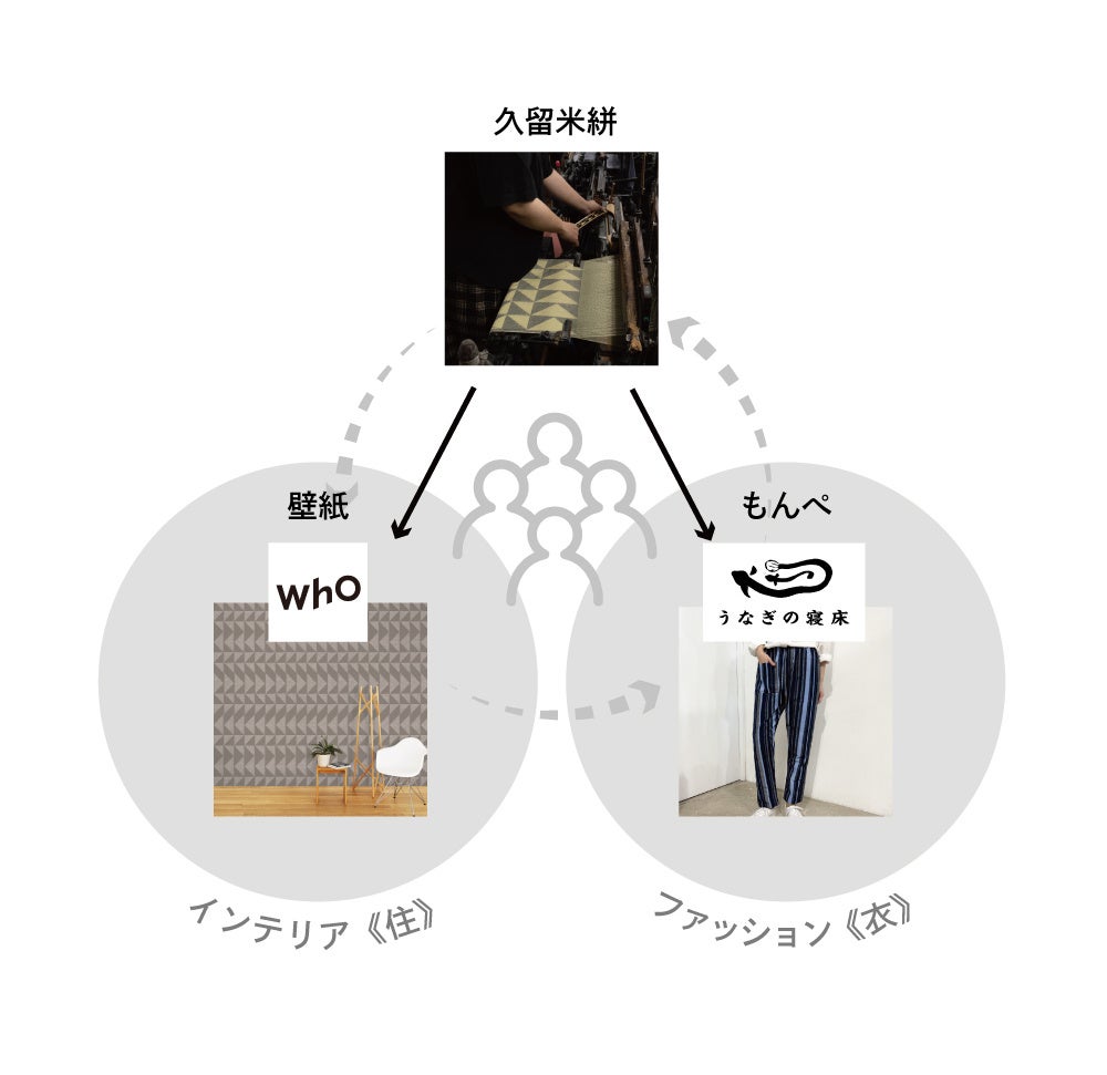 プロジェクトの背景と久留米絣との取り組みについて「伝統工芸の価値を、これからの暮らしや空間の中にどう息づかせていくか。」そんな問いのもと、久留米絣を軸に、衣と空間を横断するコラボレーションプロジェクトを立ち上げ、久留米絣の生地を用いた「もんぺ」と、その繊細な表情を壁紙として再構築したプロダクトを開発。