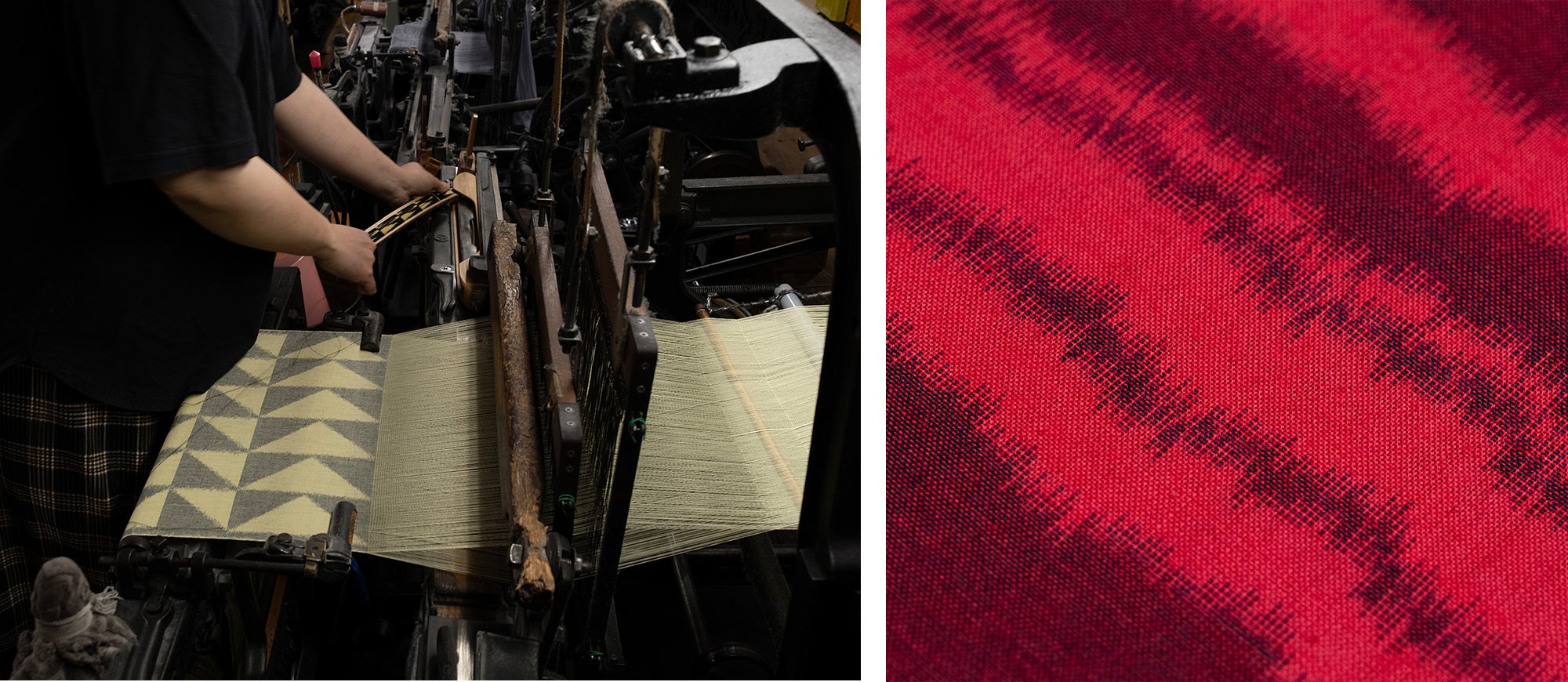 日本三大絣の一つでもある福岡・八女の伝統工芸品“久留米絣”は、図案の境界線に独特な“ゆらぎ”があり、生地を特徴づける絣模様として愛されてきました。ただその背景には、糸の染色から織り上げるまで複数の職人と数多くの工程が存在し、緻密で高度な作業が求められますが、なんとか図柄を合わせようとする中で、この絶妙な”ゆらぎ”が現れています。