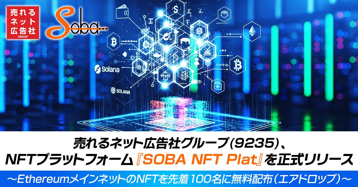 売れるネット広告社グループ株式会社(本社:福岡県福岡市、代表取締役社長 CEO:加藤公一レオ、東証グロース市場:証券コード 9235、以下 売れるネット広告社グループ)の連結子会社である株式会社SOBAプロジェクトは、NFTプラットフォーム『SOBA NFT Plat(ソバ・エヌエフティ・プラット)』の正式リリースを発表いたしました。これを記念し、Ethereumメインネット上で発行される記念NFTを、先着100名様限定で無料配布(エアドロップ)いたします。