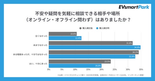 さらに、EVの購入検討時に「相談できる相手や場所がなかった」と回答した人は47.2%にのぼり、購入後でも42.4%が「十分に相談できる環境ではなかった」と回答しています。