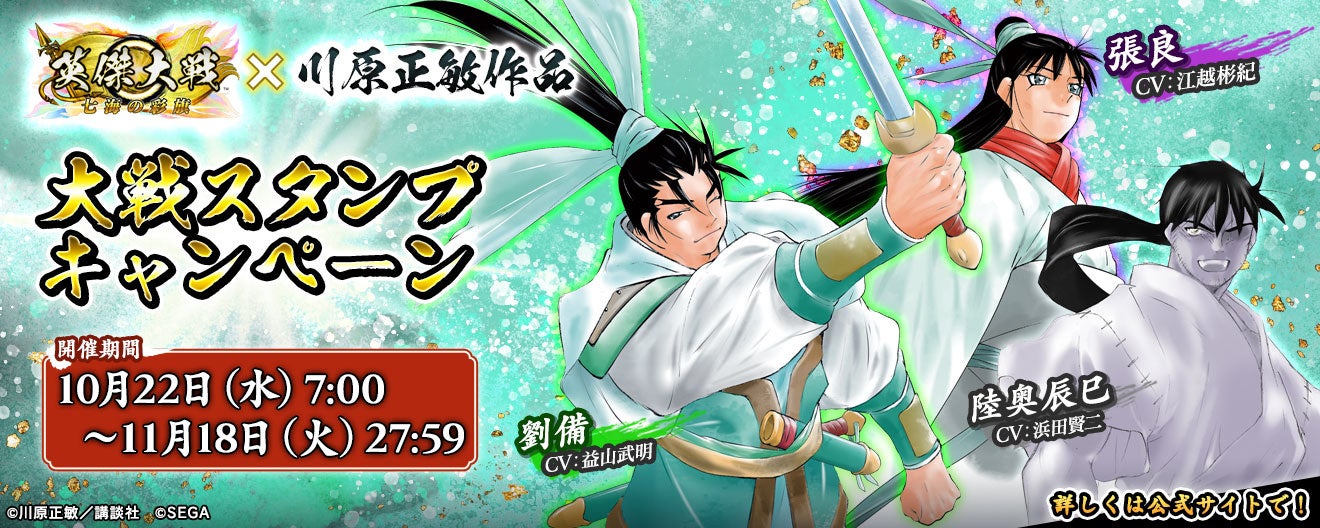 株式会社セガ フェイブ(本社:東京都品川区、代表取締役社長執行役員:杉野行雄)は、現在稼働中のアミューズメント施設向け対戦型カードアクションゲーム『英傑大戦 七海の彩旗(以下、英傑大戦)』において、漫画家 川原正敏先生の作品とのコラボイベントを、本日2025年10月22日(水)より開始したことをお知らせいたします。