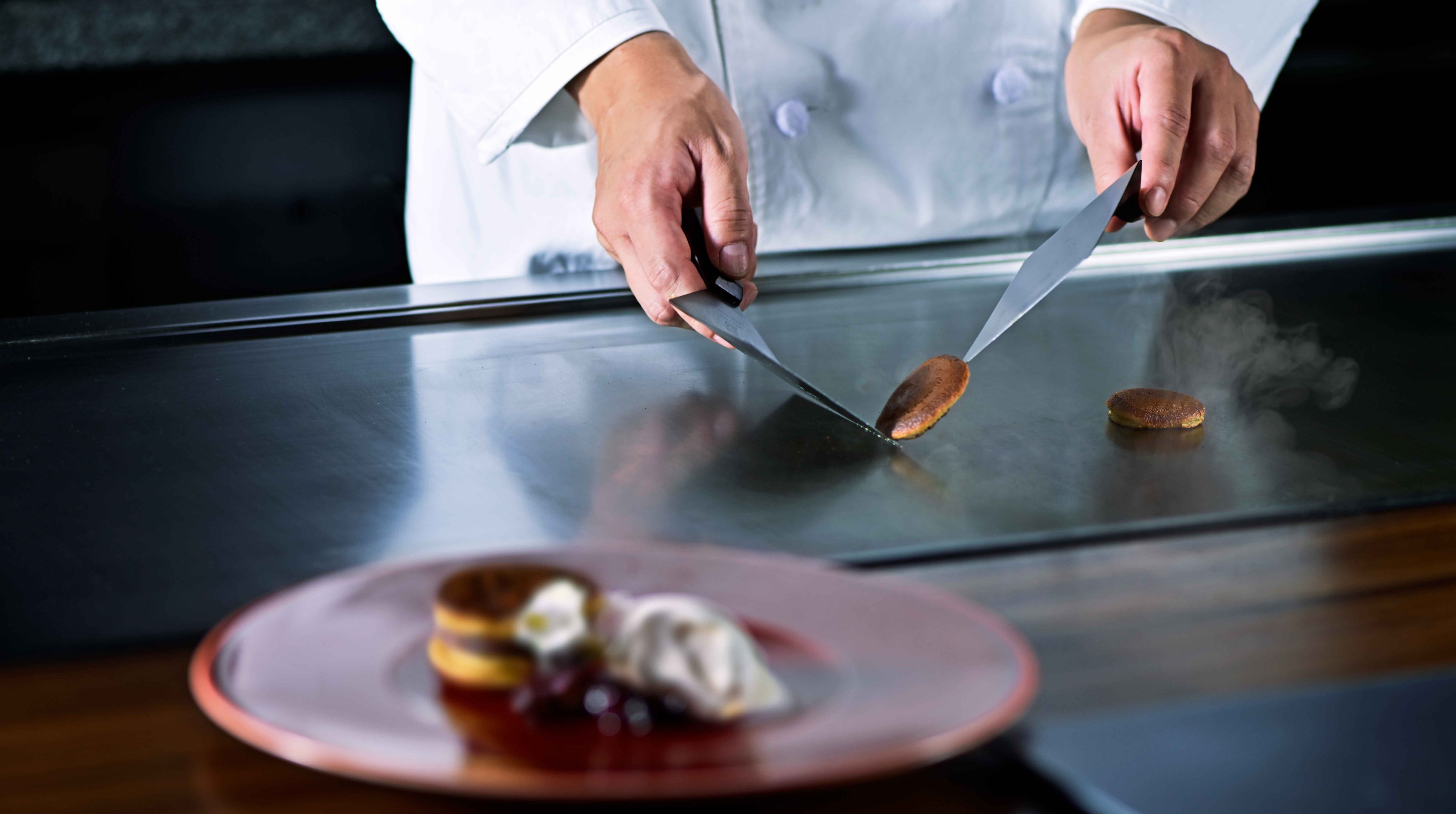 ■デザートにもライブ感を楽しんでいただける演出を コースの締めくくりにも、鉄板焼きならではの演出を。ほっこりした味わいが恋しい秋から冬の時期には、目の前で仕上げる焼きたてのどら焼きをお楽しみください。季節ごとの素材とシェフのアイデアから生まれる、ライブ感いっぱいのデザートもまた、瓊鶴海鉄板焼きのエンターテイメントです。