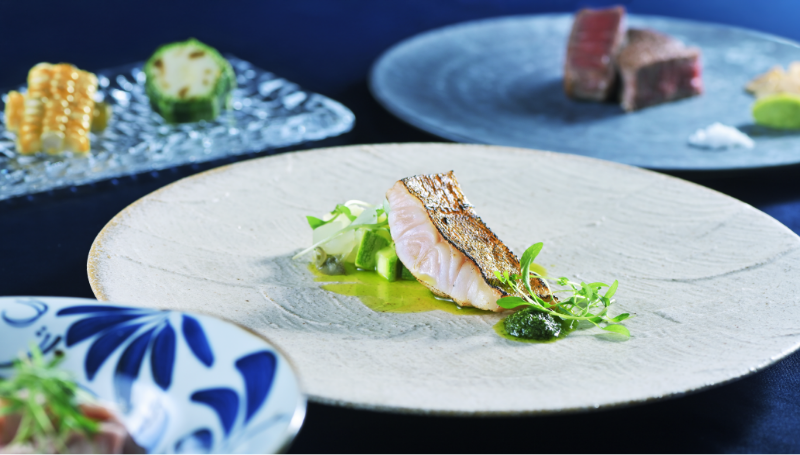 ■器もまた目で味わうごちそう 私たちは、器もまた、料理の魅力を最大限に引き出し、お客様の感動を深めるための重要な要素であると考えます。特に長崎の伝統工芸品である「波佐見焼」や、日本を代表する磁器「有田焼」は、瓊鶴海の料理を引き立てる大切な演出のひとつです。また、日本酒のご提供に用いる江戸切子は、当店オリジナルの酒器です。この他にも、シンプルなデザインで料理を引き立てる白磁や、美術品のような華麗な染付など、和食器・洋食器といった区別にとらわれず、料理の個性やコースのストーリーに応じた器のセレクトにも目を留めていただき、存分に堪能していただきたいと願っています。