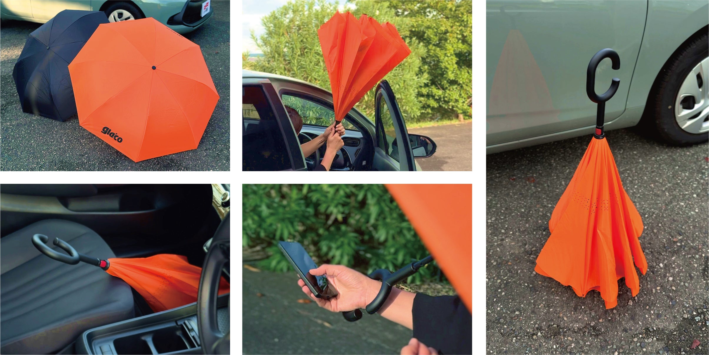 一般的な傘と違い、逆さまに閉じることができるため、雨の日の車の乗り降りがスムーズになるとともに、雨で濡れた面が内側にくることで、車内に持ち込んだ際にシートなどが濡れにくく、傘を畳む時に手も濡れにくい仕様の、特にドライバーの方に使い勝手のいいオリジナルの逆さ傘です。