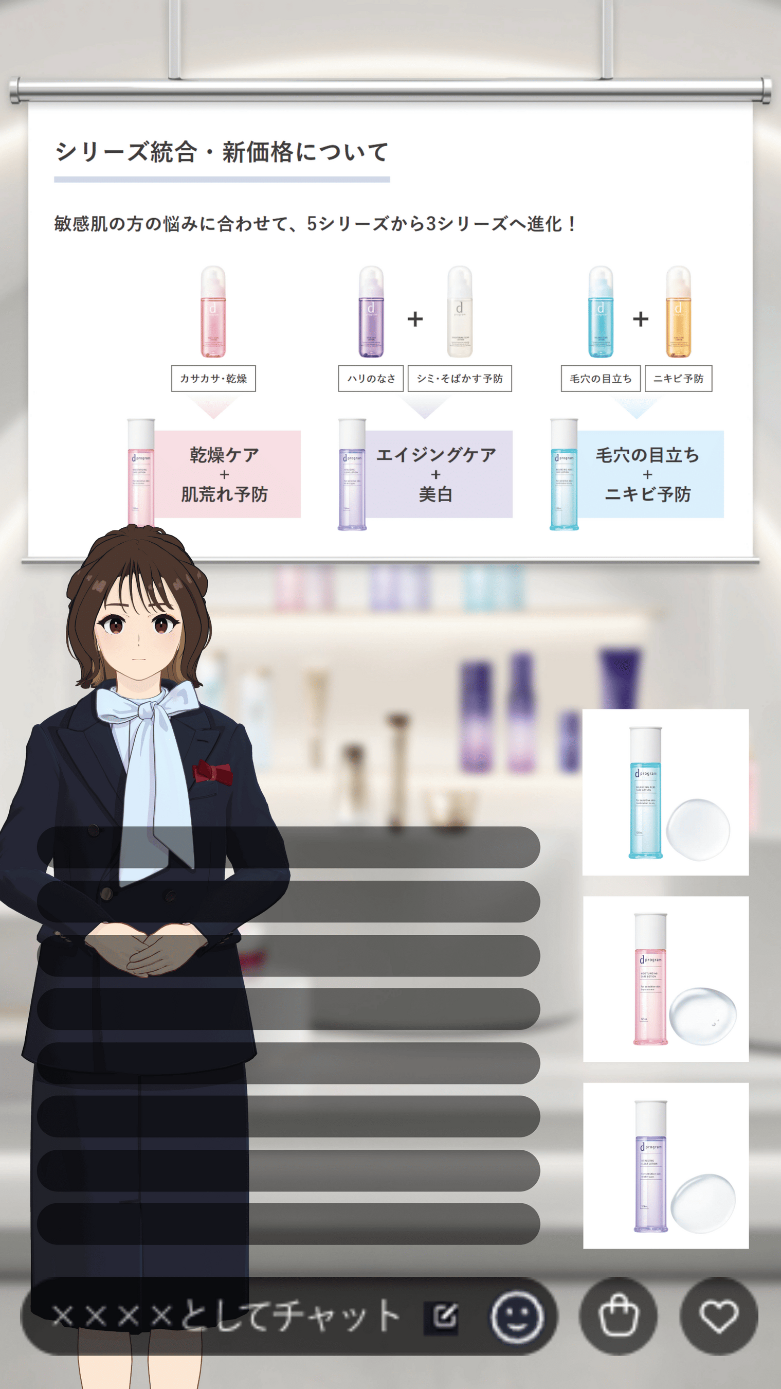 「キャラクター」という特徴を持つアバターは、単なる”相談相手”にとどまらず”共感者”として受け入れられる傾向があり、人に対して無意識に抱きがちな先入観や緊張感の軽減効果を期待できます。アバターPBPによる新たな接客スタイルで、お客さまがより安心してパーソナルな美容相談を受けることができる機会を提供します。特にアバターとの親和性が高い若年層の購買行動が「コト体験」へとシフトするなか、ストーリーテリングやエンタメ性のあるライブ視聴体験を提供することで、若年層との接点拡大を図ります。さらに、男性化粧品市場の急速な成長を背景に、男性のお客さまへのアプローチも強化します。
