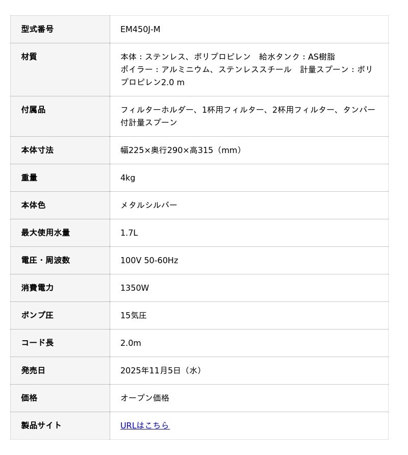 デロンギ・ジャパン株式会社(本社:東京都港区 代表取締役社長:甲斐ラース)は、自宅で本格的なカフェ体験を叶える「クラシック エスプレッソ・カプチーノメーカー(EM450J-M)」(以下、クラシック(EM450J-M))を2025年11月5日(水)より新発売いたします。