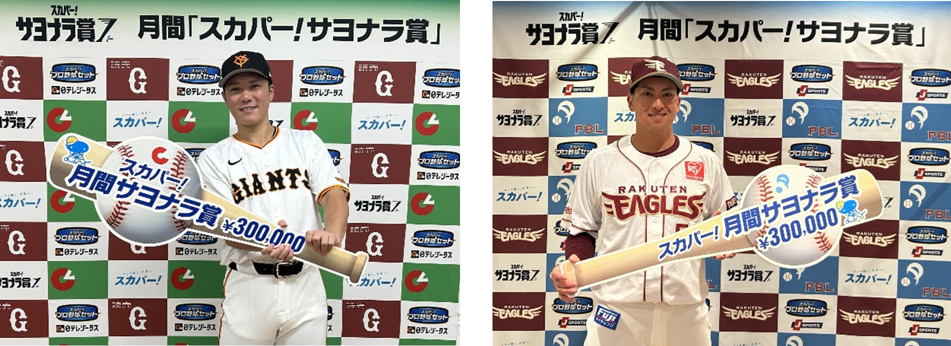 スカパー! は、プロ野球を盛り上げるべく、2012年よりセントラル、パシフィック両リーグが制定する月間「スカパー! サヨナラ賞」に協賛しています。本賞は月間を通じて最もインパクトのあるサヨナラ打を放った選手を両リーグから1名ずつ選出し、スカパー! よりトロフィーと賞金30万円をお贈りするものです。