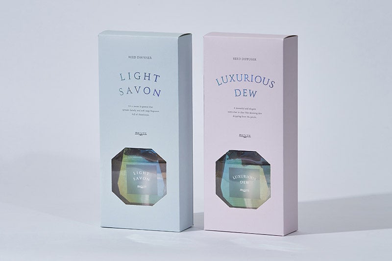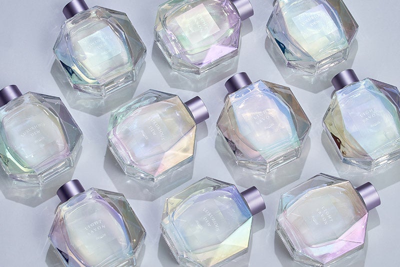 香水瓶のようなカッティングガラスに、オーロラの輝きをまとわせた美しいボトルが魅力。香りは華やかで爽やかな人気の2種をセレクト。