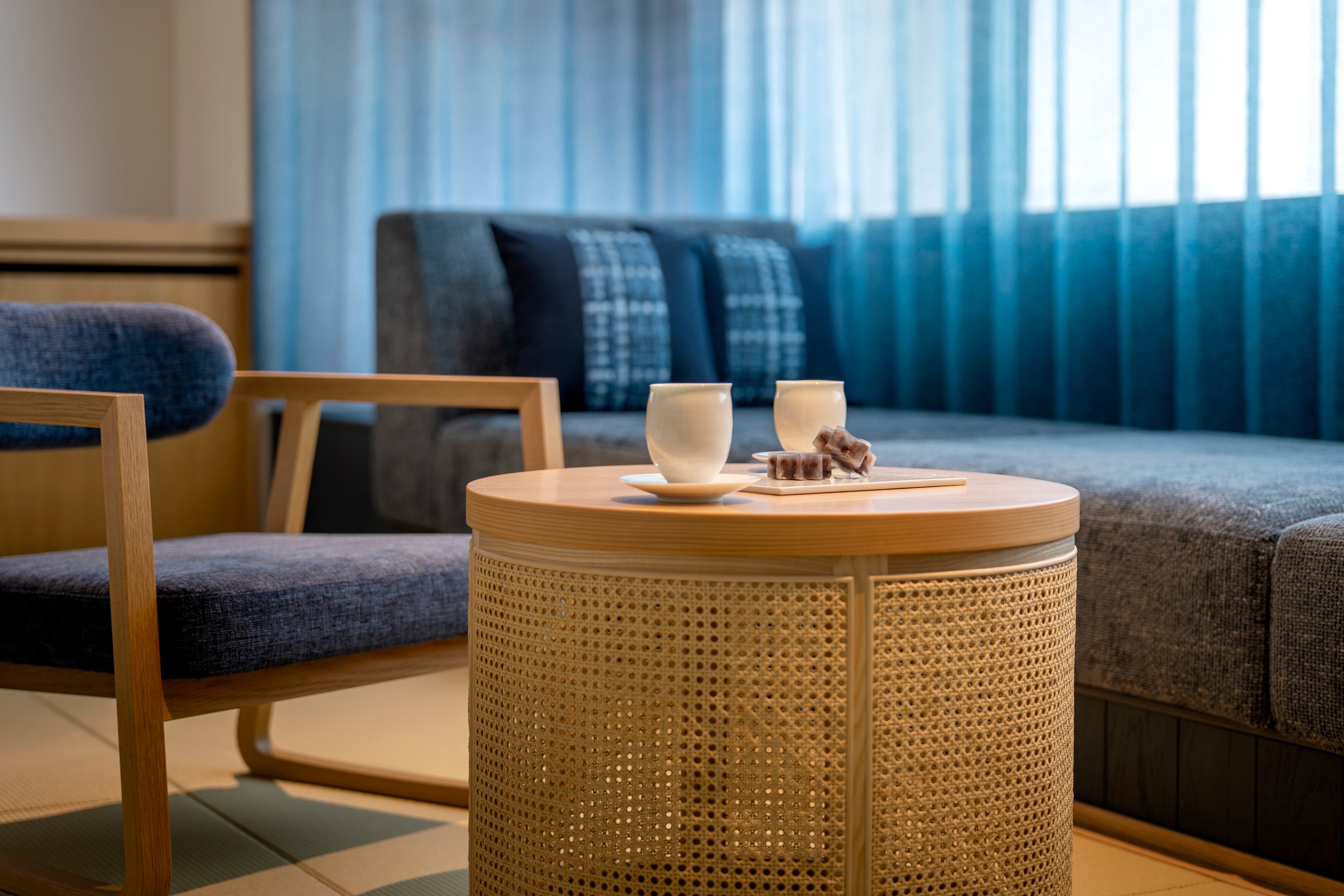ソファには、広島県福山市を中心とする備後地域で生産される高品質な福山デニムのクッションを配します。日本を代表するデニム産地である備後地域では、江戸時代から受け継がれてきた伝統工芸「備後絣(びんごかすり)」の技術をルーツに、美しい色落ちと深みのある藍色を生み出す高度な染色技術が継承されています。