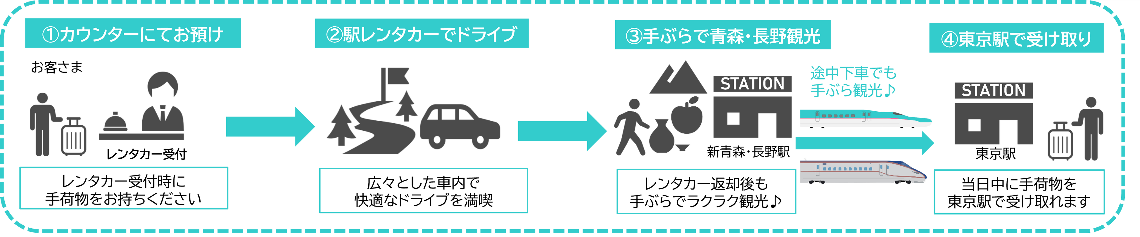 JR駅レンタカー新青森営業所・長野営業所にてレンタカー受付時にお預けいただいた手荷物を、当日中に東京駅の指定手荷物預かり所でお受け取りいただけるサービスです。