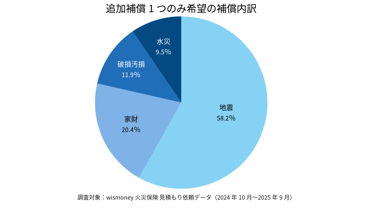 追加補償を1つのみ希望した人の中では、「地震保険」が58.2%と圧倒的に多く、次いで「家財保険」(20.4%)、「破損汚損事故補償」(11.9%)、「水災補償」(9.5%)の順となりました。