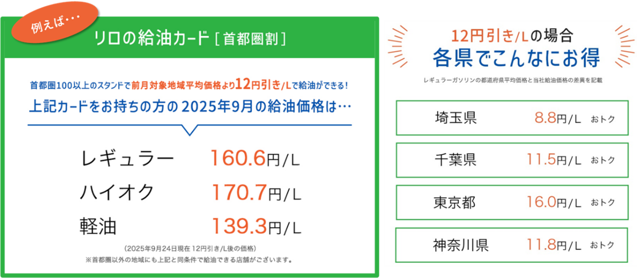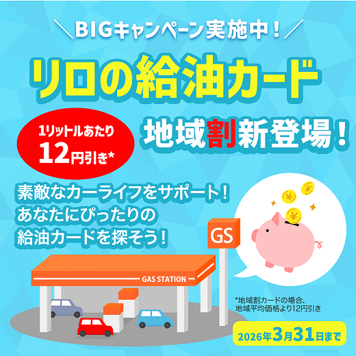 また、「リロの給油カード 地域割」新登場を記念し、2025年10月から2026年3月31日まで、対象地域平均価格マイナス12円のBIGキャンペーンを実施します!*5