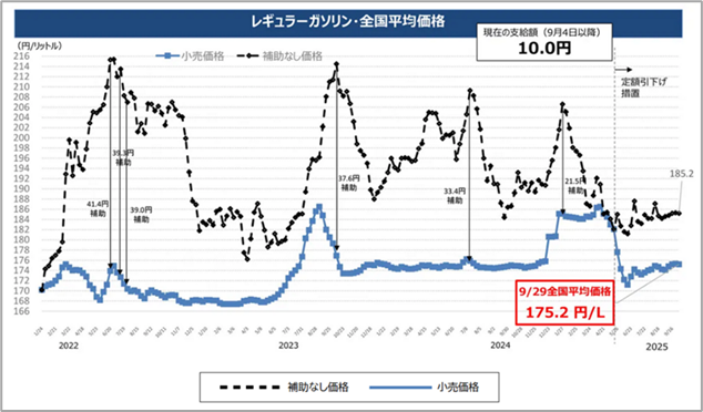 出典:経済産業省資源エネルギー庁 レギュラーガソリン・全国平均価格推移 https://nenryo-teigakuhikisage.go.jp/