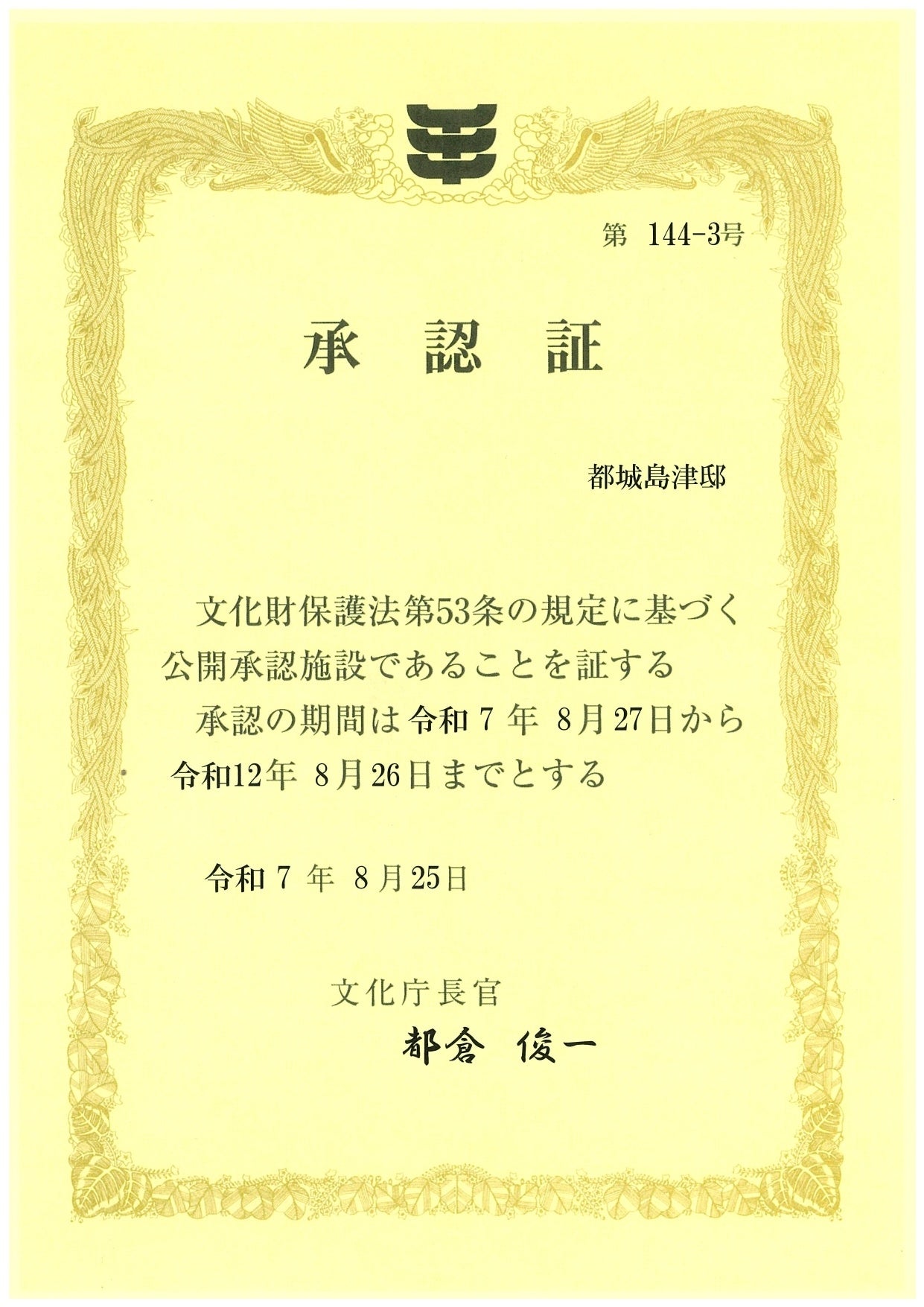 令和7年8月8日付けで申請していた「公開承認施設」の承認について、同月27日付けで文化庁から承認されました。平成27年8月27日に宮崎県で初めて承認されて以降、5年ごとの更新を行い、今回で3回目の承認となります。