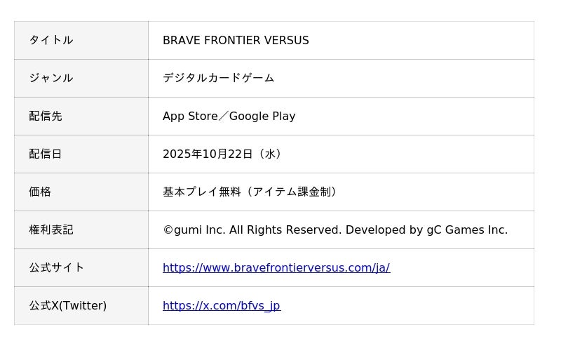 株式会社gumi(本社:東京都新宿区、代表取締役社長:川本 寛之)は、連結子会社の株式会社gC games(本社:東京都新宿区、代表取締役社長:寺村 康)がスマートフォン向け本格RPG『ブレイブ フロンティア』シリーズの最新作となるアプリゲーム『BRAVE FRONTIER VERSUS』を、2025年10月22日(水)よりApp StoreおよびGoogle Playにて世界同時配信を開始したことをお知らせいたします。