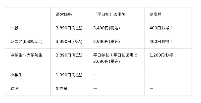 ※「平日割」の対象は一般・シニア料金のお客様です。※「平日割」・「平日学割」はキャンペーン開催期間中の土日・祝を除く平日のみが割引適用となります。※幼児は保護者1名様につき幼児2名様まで。3名様以上は1名様につき990円(税込)頂戴いたします。※学割は学生証ご提示の本人に限り有効です。