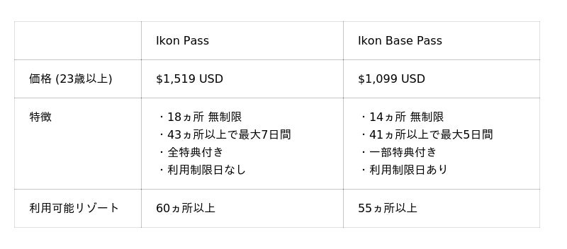 内容:「Ikon Pass」(加盟リゾート全て利用可能、各施設最大7日間使用可能)や「Ikon Base Pass」を販売