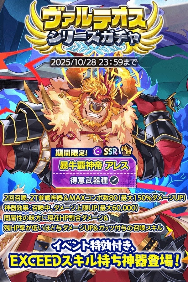 イベント特攻付き、EXCEEDスキル持ちの新シリーズ神器が登場する「ヴァルテオスシリーズガチャ」が開催!今回は「暴牛覇神帝 アレス」が登場します!イベント特攻付き、EXCEEDスキル持ちの強力な神器をお見逃しなく。