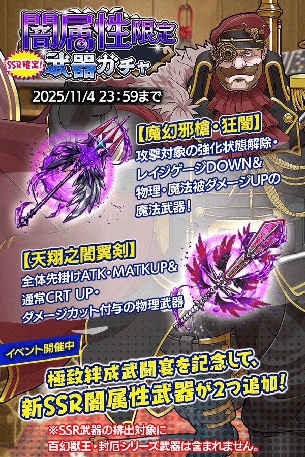 また、極致絆成武闘宴を記念して『闇属性限定武器ガチャ』が登場!新たに『天翔之闇翼剣』、『魔幻邪槍・狂闇』の2つの武器が追加されます。