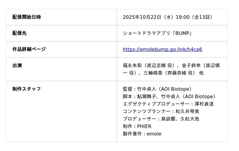 ショートドラマアプリ「BUMP」を運営するemole株式会社(本社:東京都目黒区、代表取締役:澤村直道、以下 emole)は、2025年8月27日の配信開始直後からBUMP総合ランキング1位を獲得した『不倫暴露パーティ ~見下す夫と同級生に制裁を~』に続く、オムニバスの続編『不倫暴露パーティ ~美人教師の罠~』を、2025年10月22日(水)19:00より独占配信いたします。