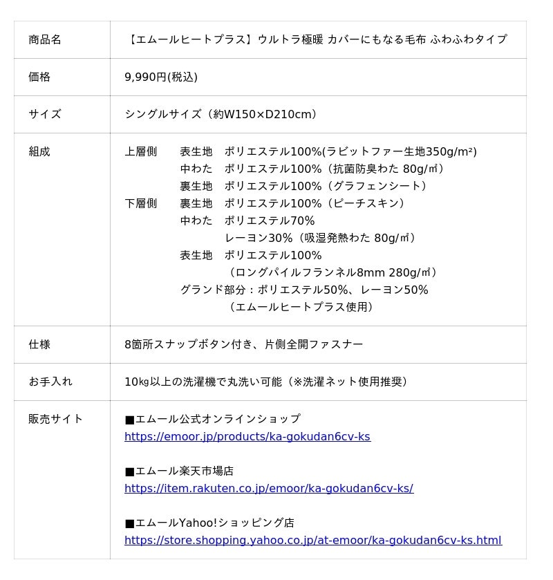 「身体に合った寝る・座る・たたむ」を提供する健康家具ブランドEMOORを展開する株式会社エムール(東京都立川市:代表取締役 高橋 幸司/以下エムール)は、2025年10月21日より、『ウルトラ極暖 カバーにもなる毛布〈ふわふわタイプ〉』の販売を開始しました。『ウルトラ極暖 カバーにもなる毛布〈ふわふわタイプ〉』は、両面に吸湿発熱素材「エムールヒートプラス」と高熱伝導「グラフェン」シートを備えた6層構造で、素早く暖めつつ熱を逃さず長く持続。ふわふわのラビットファータッチと、毛布にもカバーにも使える2WAY設計が、寝室もリビングも優雅に彩ります。